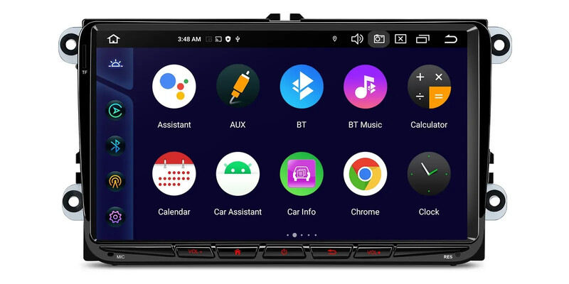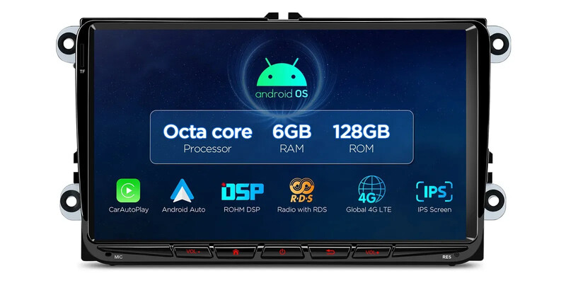 Android 14 Octa Core 6GB DDR4 RAM + 128GB SSD ROM 9'' 1280x720 QLED IPS displej Autorádio GPS navigační systém s integrovaným globálním 4G řešením Vestavěné CarPlay a Android Auto a ROHM DSP Rádio TDA7708 s RDS Zesilovač TDA7388 USB tethering Adaptivní UI podpora AHD kamer pro Volkswagen/Škoda/Seat