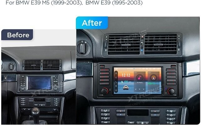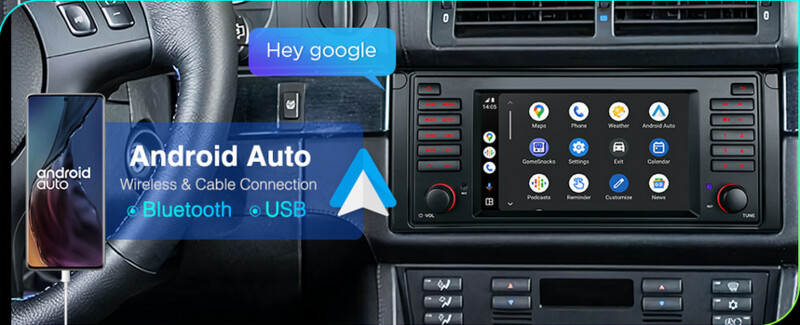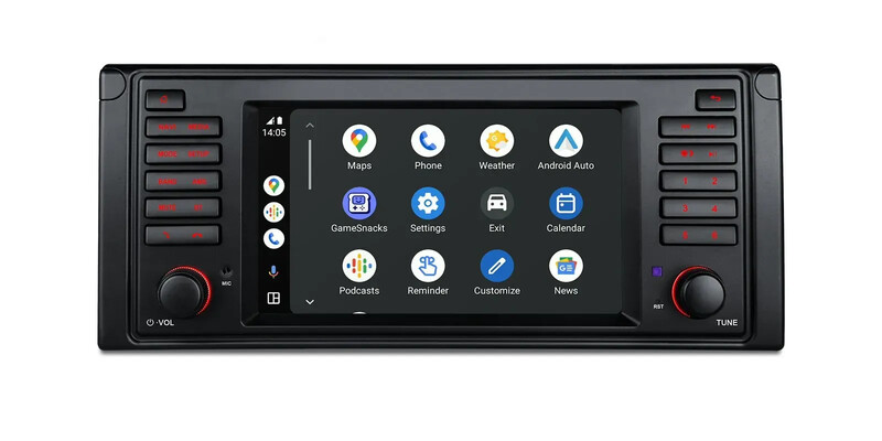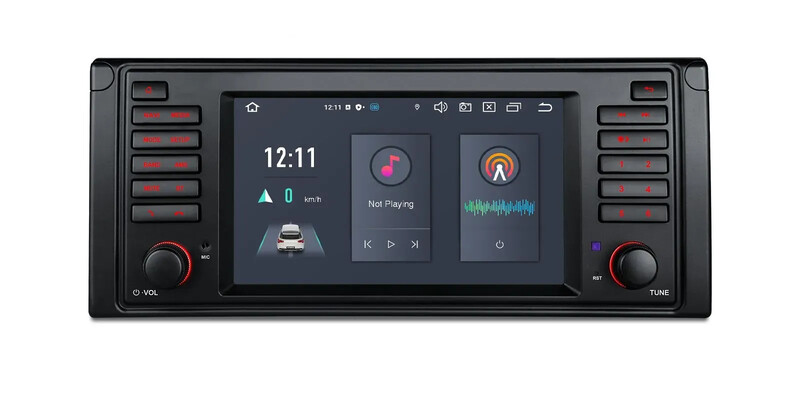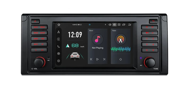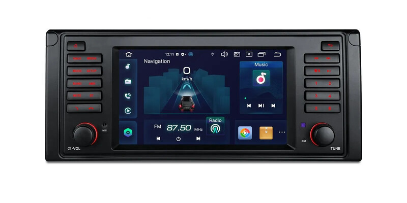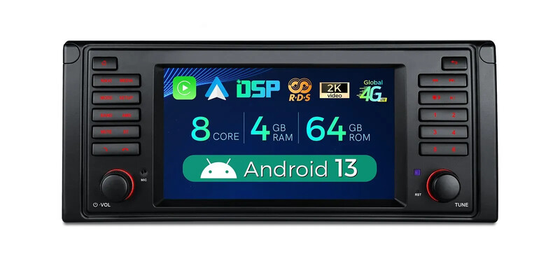 Android 14 Octa Core 4GB DDR4 RAM + 64GB SSD ROM 7'' 1024x600 kapacitní dotyková obrazovka autorádio GPS navigační systém s integrovaným globálním 4G řešením Vestavěné CarPlay a Android Auto a AKM DSP SI4755 rádio s RDS TDA7388 zesilovač Podpora USB tetheringu AHD kamery Přehrávání 2K videa pro BMW E39
