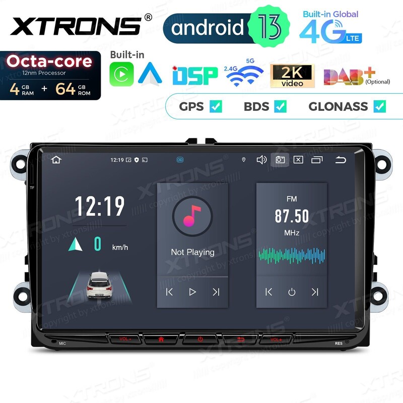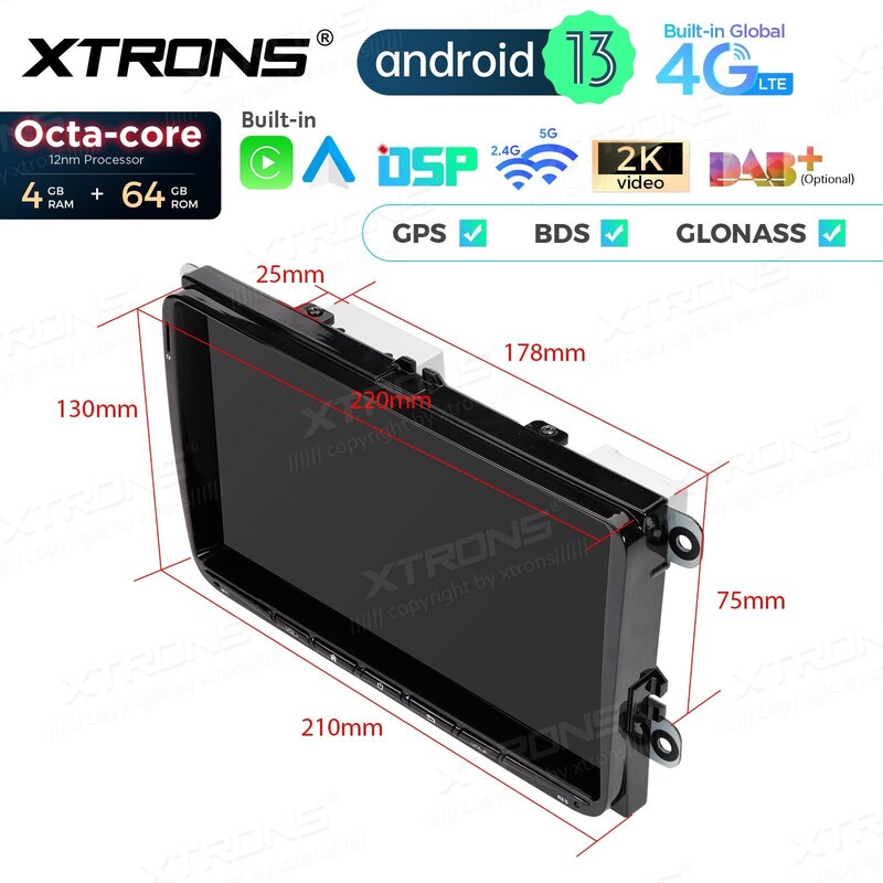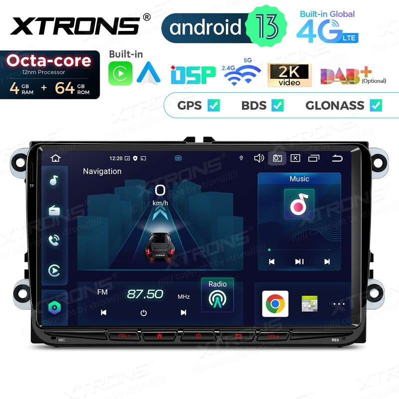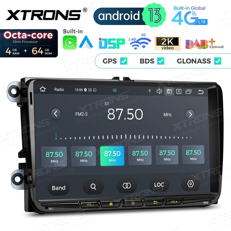 Android 14 Octa Core 4GB DDR4 RAM + 64GB Solid State ROM 9'' 1280x720 kapacitní dotykový displej Auto Stereo GPS navigační systém s integrovaným globálním 4G řešením Vestavěný CarPlay & Android Auto & AKM DSP SI4755 Rádio s RDS TDA7388 Zesilovač USB Tethering Podpora AHD kamer 2K Video Playback pro VW/Skoda/Seat