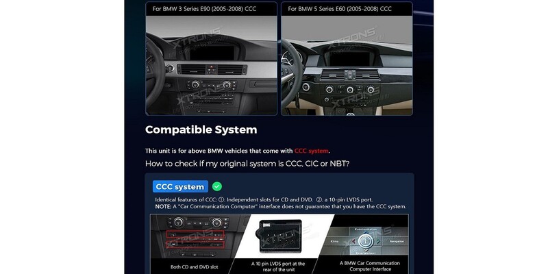 **Tato jednotka je určena pro výše uvedená vozidla BMW, která jsou dodávána se systémem CCC. Jak zkontrolovat, zda je můj původní systém CCC, CIC nebo NBT? CCC systém - Identické vlastnosti CCC: ①. Nezávislé sloty pro CD a DVD. 2. 10kolíkový port LVDS. POZNÁMKA: Rozhraní "Car Communication Computer" nezaručuje, že máte systém CCC.
