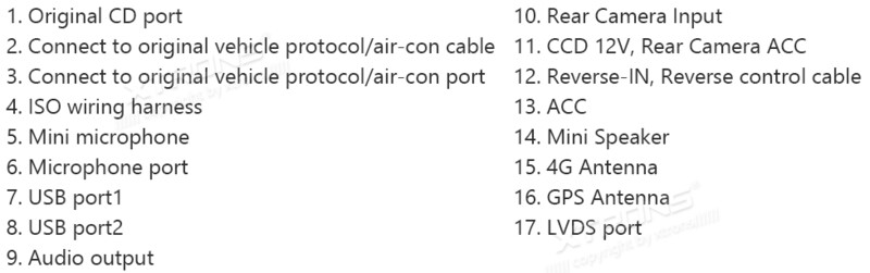 1 x kabelový svazek ISO, 1 x prodlužovací audio kabel, 1 x kabel nouzového osvětlení, 1 x anténa 4G 1 x kabel LVDS, 1 x anténa GPS, 1 x kabel AMI, 1 x pinzeta, 1 x pevný držák, 8 x šroub, 1 x instalační rámeček, 1 x instalační návod, 1 x uživatelská příručka