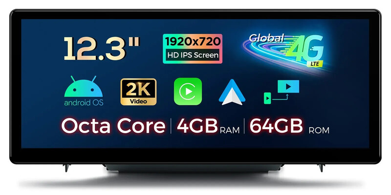 12,3" plně laminovaná 1920x720 High Fidelity IPS obrazovka Android 13 Car Stereo se 4GB DDR4 RAM EMMC 64GB Solid State ROM Integrovaná 4G LTE řešení Bezdrátové CarAutoPlay Android Auto Zrcadlení obrazovky Vestavěné DSP Přehrávání 2K videa Podporuje AHD kameru pro Audi