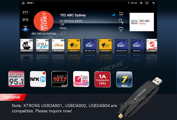 USB 2.0 Digital DAB+ Radio Tuner Stick pouze pro XTRONS Android Car Stereo. Super silná ochrana proti rušení: SNR je více než 95 dB, rychlost kódování je 192 kbps, což je vhodné pro použití v intenzivním pohyblivém prostředí, jako je použití v autě.