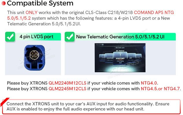 Upozorňujeme, že pokud vaše vozidlo pochází z let 2004-2008 a je vybaveno systémem COMAND APS NTG 1.0, musíte si u společnosti XTRONS objednat dodatečný optický dekodér, abyste zachovali systém COMAND ve vašem vozidle. (XTRONS FOBB01 je kompatibilní).