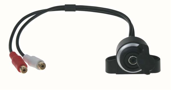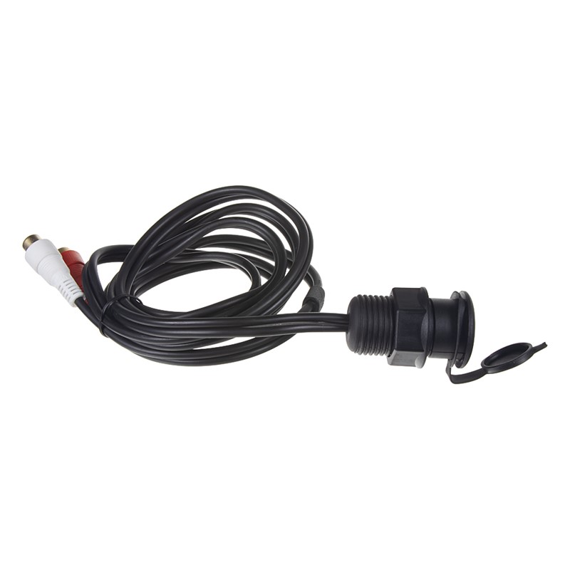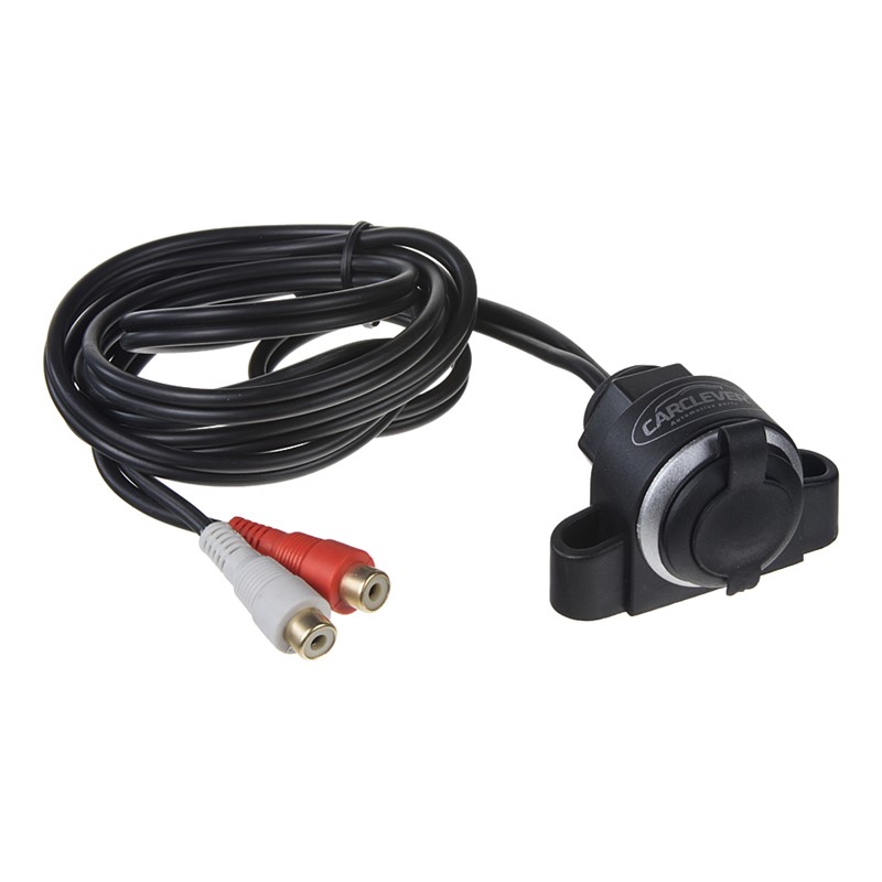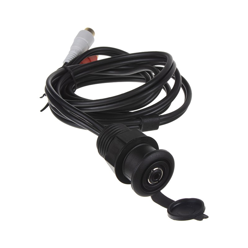 Krátký popis Voděodolná zásuvka s konektorem AUX 3,5 mm Jack, zakončená 2x konektorem RCA Cinch samice.   Vlastnosti: • umožňuje připojení mobilního telefonu, MP3 přehrávače nebo jiného zařízení k autorádiu s RCA AUX vstupem • délka kabelu: 30 cm • montáž na palubní desku nebo do odkládací schránky do otvoru o průměru 22 mm • montáž na vodorovnou plochu pomocí přiloženého držáku • gumová odnímatelná krytka konektoru pro ochranu před vlhkostí